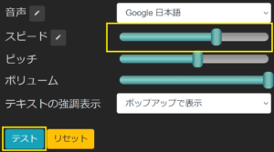 スライダーで速度を調節します。何倍速とは書かれていません。調節後は”テスト”を再生し速度を確認します。